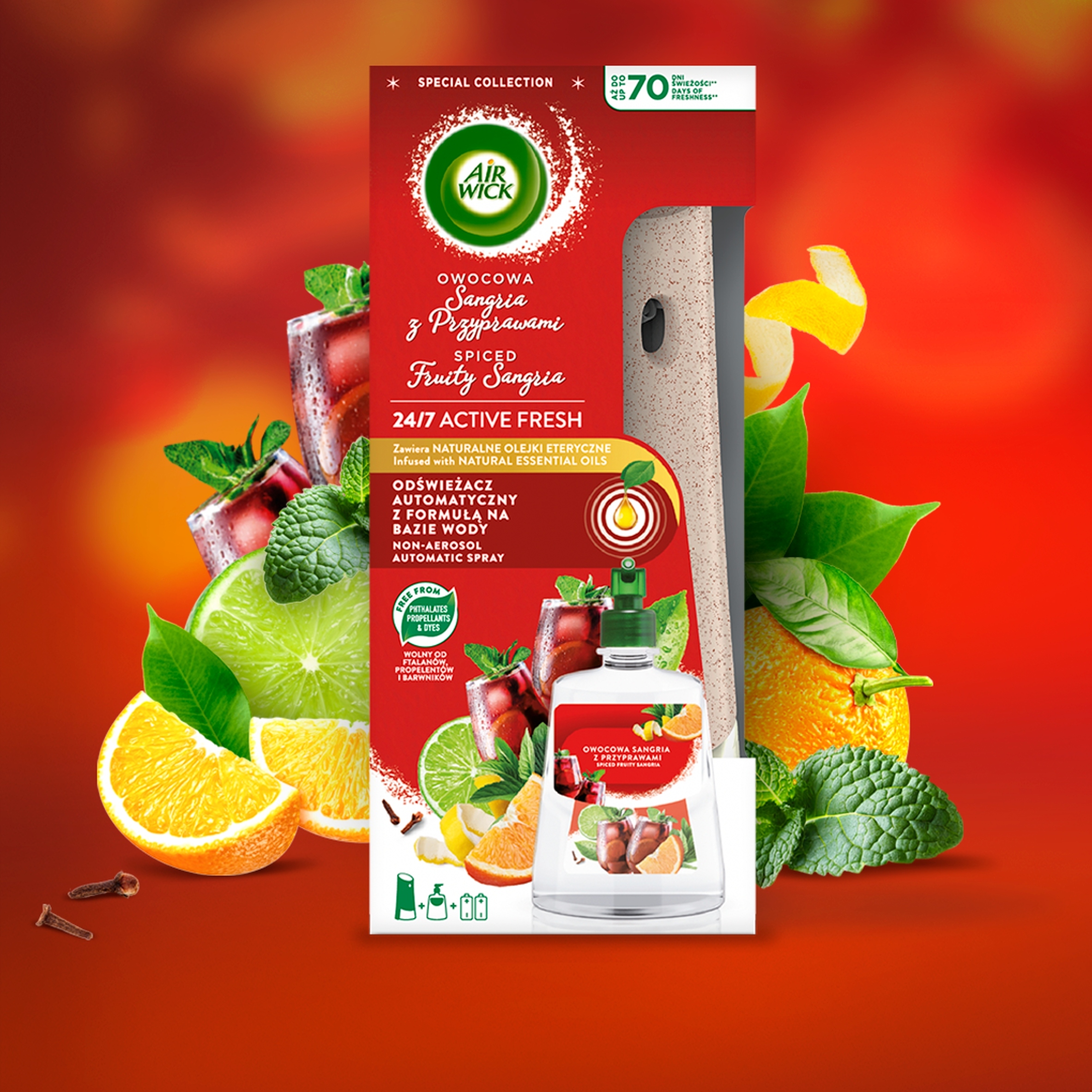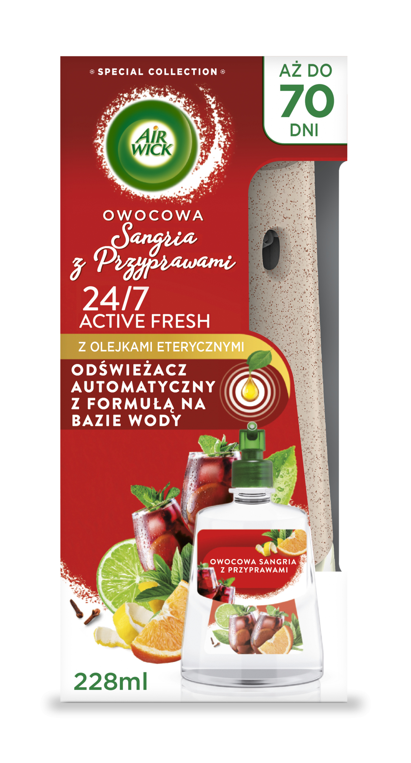 AIR WICK Automatyczny odświeżacz powietrza z wkładem Air Wick 24/7 ACTIVE FRESH o zapachu Owocowej Sangrii z Przyprawami 228 ml.
