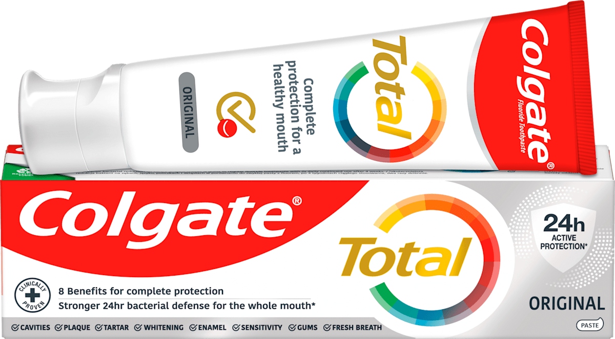 Pasta do zębów COLGATE TOTAL ORIGINAL walczy z bakteriami obecnymi na zębach, języku, policzkach i dziąsłach do 12 godzin dla zdrowia całej jamy ustnej.