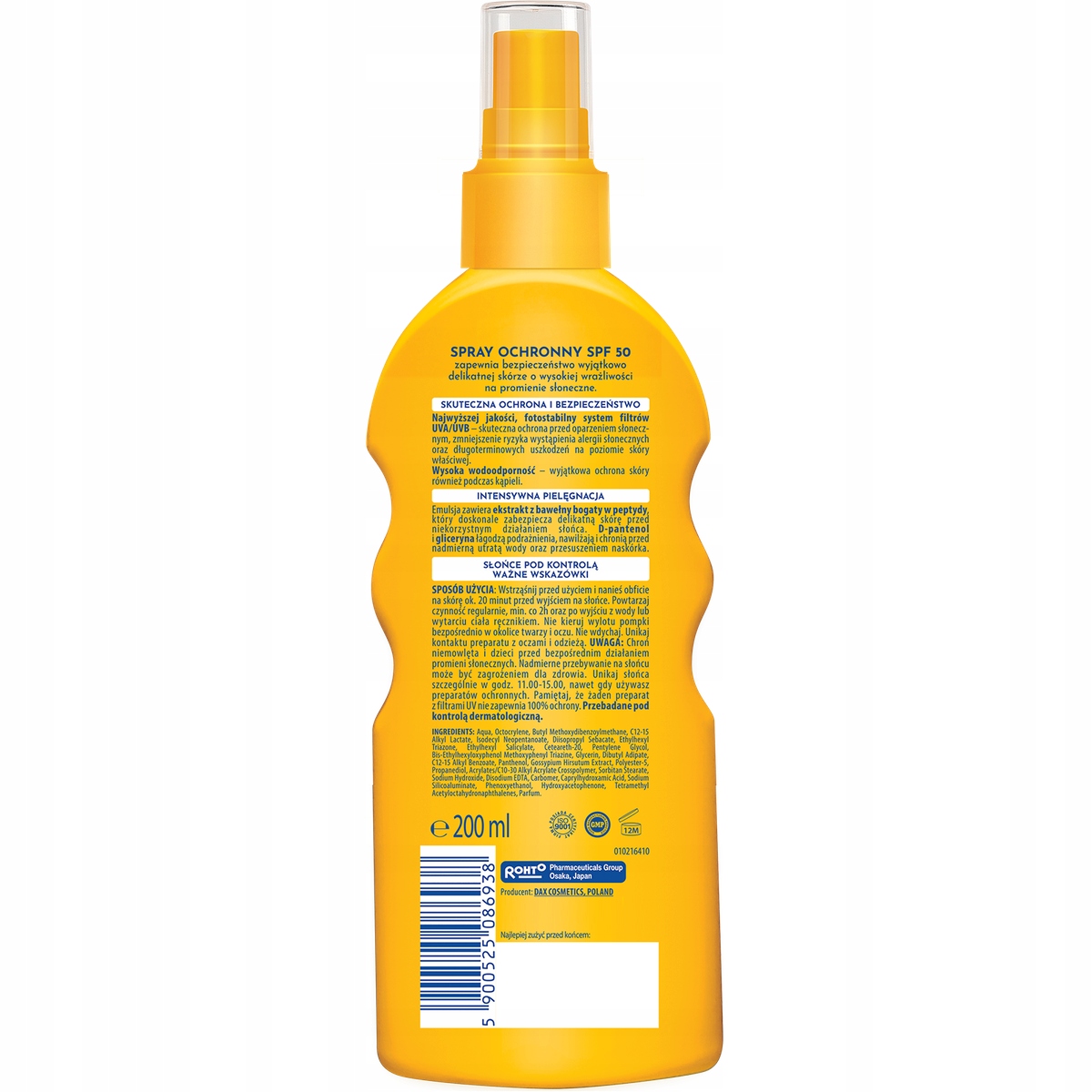 Spray ochronny SPF 50 zapewnia bezpieczeństwo wyjątkowo delikatnej skórze o wysokiej wrażliwości na promienie słoneczne. SKUTECZNA OCHRONA I BEZPIECZEŃSTWO Najwyższej jakości fotostabilny system filtrów UVA/UVB – skuteczna ochrona przed oparzeniem słonecznym, zmniejszenie ryzyka wystąpienia alergii słonecznych oraz długoterminowych uszkodzeń na poziomie skóry właściwej. Wysoka wodoodporność – wyjątkowa ochrona skóry również podczas kąpieli. INTENSYWNA PIELĘGNACJA Emulsja zawiera ekstrakt z bawełny bogaty w peptydy, który doskonale zabezpiecza delikatną skórę przed niekorzystnym działaniem słońca. D-pantenol i gliceryna łagodzą podrażnienia, nawilżają i chronią przed nadmierną utratą wody oraz przesuszeniem naskórka. SŁOŃCE POD KONTROLĄ