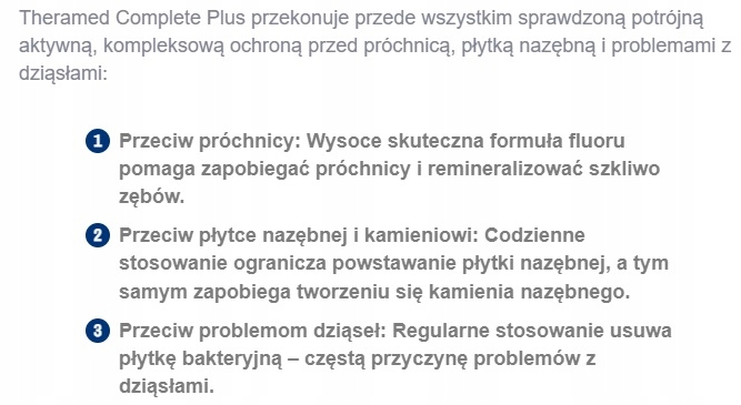 Theramed Complete Plus gwarantuje przede wszystkim sprawdzoną wszechstronną ochroną przed próchnicą, płytką nazębną i problemami dziąseł: