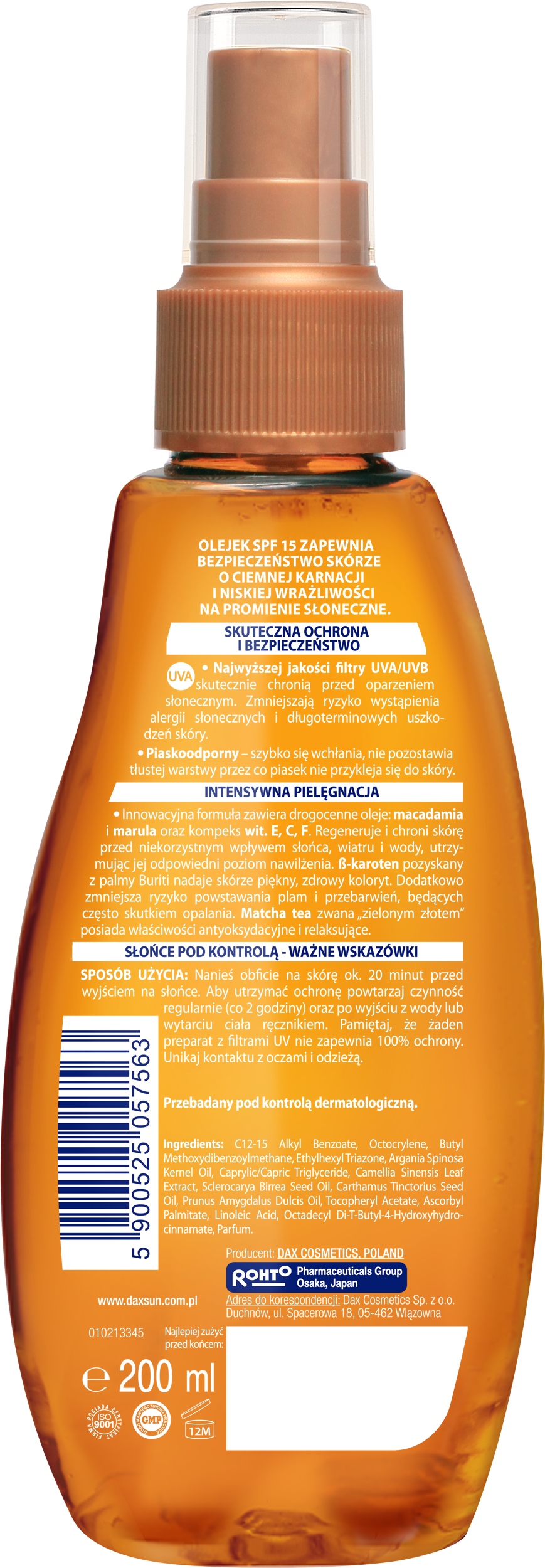 Innowacyjna formuła zawiera drogocenne oleje: macadamia i marula oraz kompeks wit. E, C, F. Regeneruje i chroni skórę przed niekorzystnym wpływem słońca, wiatru i wody, utrzymując jej odpowiedni poziom nawilżenia. ß-karoten pozyskany z palmy Buriti nadaje skórze piękny, zdrowy koloryt. Dodatkowo zmniejsza ryzyko powstawania plam i przebarwień, będących często skutkiem opalania. Matcha tea zwana „zielonym złotem” posiada właściwości antyoksydacyjne i relaksujące.